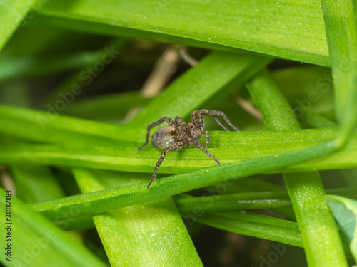 © Stephan Morris , Fototapeta premium A Small Wolf Spider on a Bluebell leaf, Pardose sp