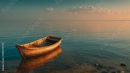 © Sascha, Naklejka premium A small wooden boat drifts alone on a tranquil golden sea beneath a vast, open sky. Generative AI