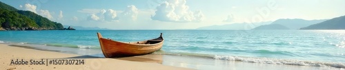 © Thanwara, Naklejka premium A small wooden boat gently rests on a tranquil, sandy shore at low tide, surrounded by calm water and serene nature The scene evokes peace and quiet, ideal for relaxation themes , texture, solitude