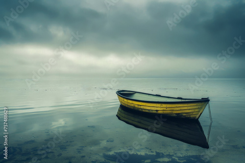 Naklejka premium A small yellow boat sits in the water, with the sky above it looking cloudy
