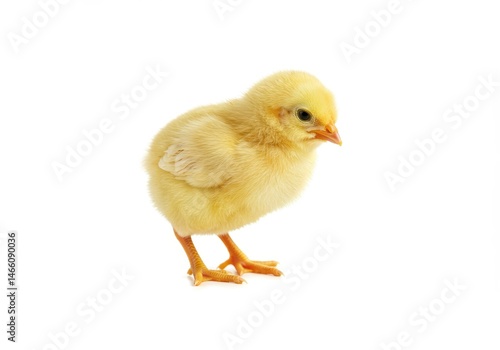 Obraz premium A small yellow chick stands alone on a white background in a studio shot,...