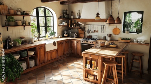 Fototapeta premium A small yet stylish French kitchen with modern amenities, wooden accents, and...