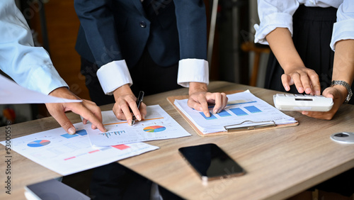 © bongkarn, Fototapeta premium A smart business people in the meeting, analyzing financial sales data on the report