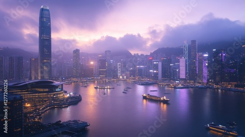 © Puttipong, Fototapeta premium A smart city at dusk with cyber-themed digital overlays showcasing data-driven engineering.