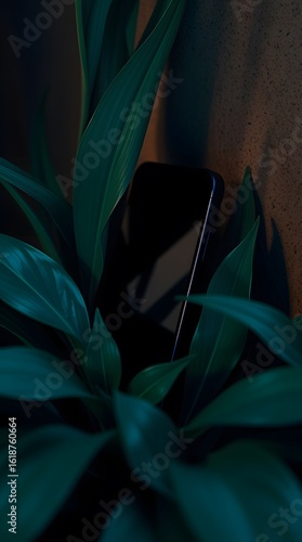 © dePICsignSTOCKS, Fototapeta premium A smartphone placed in a pot foradvertisement commercial purpose