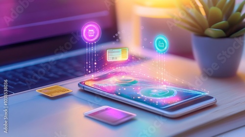 Fototapeta premium A smartphone with digital icons above it, symbolizing technology.