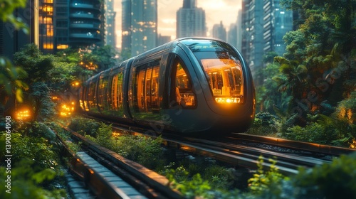 Naklejka premium A smarttrain glides smoothly on tracks surrounded by lush greenery and skyscrapers, emphasizing the integration of nature and advanced mobility technology in urban settings.