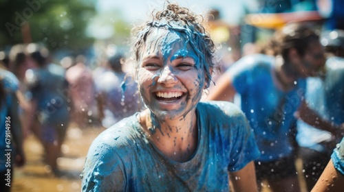 Obraz premium A smiling American woman wearing a blue floral shirt happily plays in the water during the Songkran festival in central Thailand.