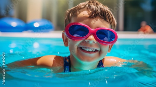 Naklejka premium A smiling boy in swimming glasses in swimming pool