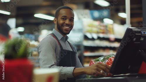 Fototapeta premium A smiling cashier scanning groceries at a supermarket checkout , friendly assistant, photo style