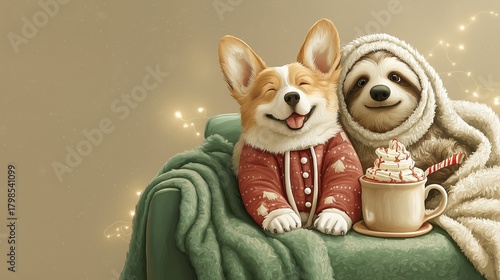 Obraz premium A smiling corgi and relaxed sloth sit wrapped in blankets with a cup of whipped cocoa beside them. The warm composition represents friendship, comfort, and cozy holiday atmosphere