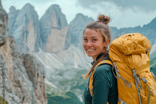 © Enrique, Naklejka premium A smiling female traveler with a yellow hiking backpack enjoys the beautiful scenery of the majestic mountains. Travel, adventure. Concept of an active lifestyle