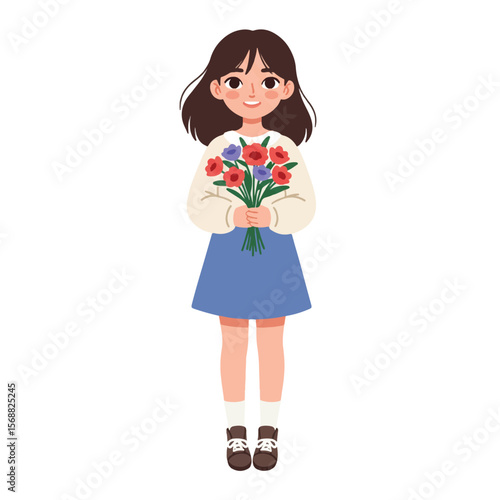 © Ahdan, Fototapeta premium A smiling girl holds a cheerful bouquet of red and purple flowers.