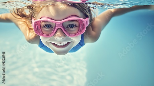 © Todd's Studio, Fototapeta premium a smiling girl swimming underwater in a pool, looking at the camera, wearing pink goggles and a blue outfit,