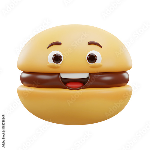 Fototapeta premium A smiling hamburger cartoon character with eyes, eyebrows, mouth, teeth, and tongue can be used for children's books.