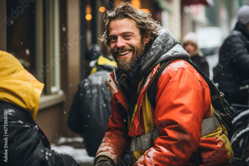 © Taras Roshchuk, Fototapeta premium a smiling homeless man sits outside during the snowfall