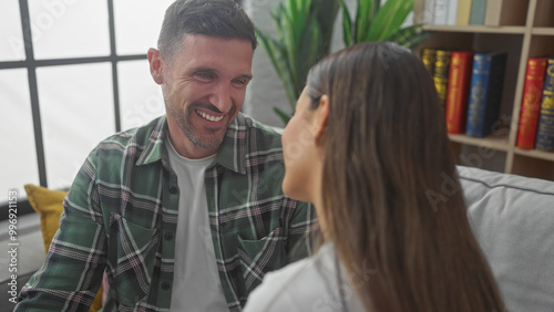 Fototapeta premium A smiling man and woman sitting together on a sofa in a cozy living room...