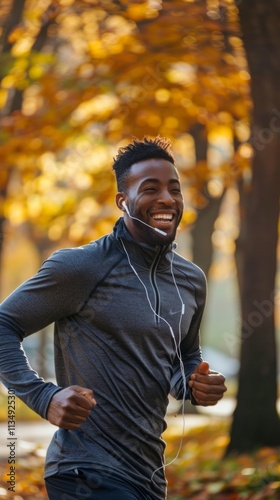 © COK House, Obraz premium A smiling man in a black shirt runs joyfully in a park with autumn leaves, wearing white earphones. The scene exudes energy and warmth.
