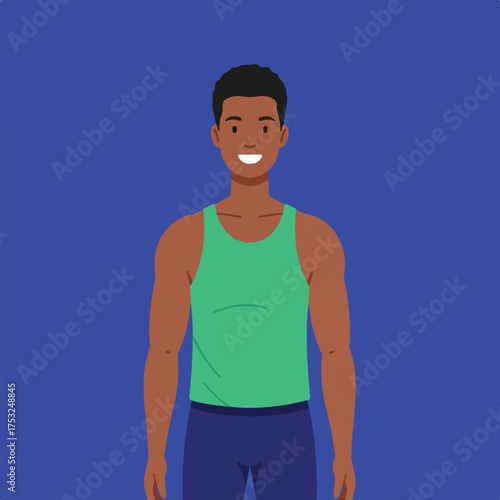 © talkative.studio, Fototapeta premium A smiling man in a green tank top and blue pants