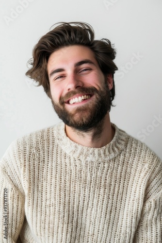 © Fotograf, Obraz premium A smiling man with a beard wearing a sweater