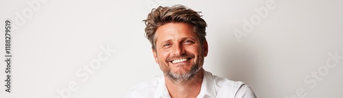 © JP STUDIO LAB, Fototapeta premium A smiling man with tousled hair poses against a plain background, exuding confidence and approachability.