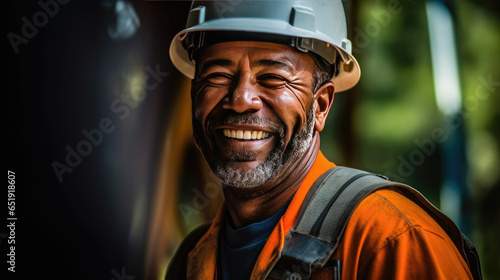 Fototapeta premium A smiling man working on a construction site, construction hard hat and work vest. middle aged. Generative Ai