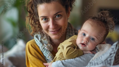 Obraz premium A smiling mother with curly hair holds her baby, who also has curly hair, in a cozy room, capturing a joyful and heartwarming moment that showcases their bonding and happiness.