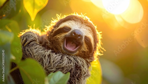 © Zubaedah, Fototapeta premium A Smiling Sloth in the Sunlight - A Moment of Joy in Nature.