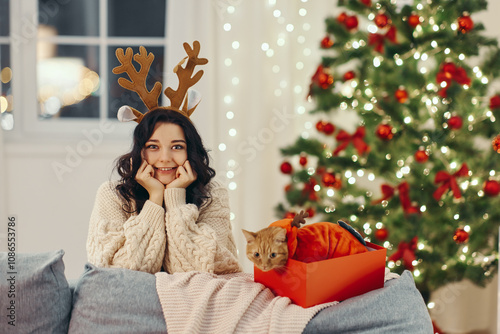 © Buyanskyy Production, Obraz premium A smiling woman in reindeer antlers and a knitted sweater sits next to a Christmas tree, with a playful cat in a red box. Great for festive holiday promotions and greeting cards.