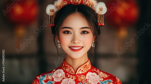 © nimaxs, Fototapeta premium A smiling woman in traditional Chinese attire with intricate embroidery and decorative accessories, set against a festive background.