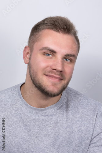 © Iuliia, Obraz premium A smiling young blond man with a beard wearing a gray shirt