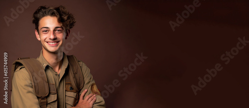 © Leaf, Obraz premium a smiling young men wearing army clothes in dark brown background generative ai
