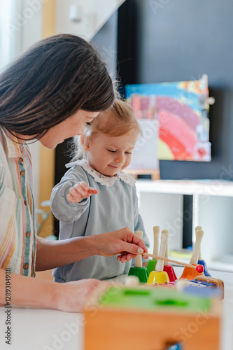© lordn, Fototapeta premium A smiling young woman and a little girl engage in a fun educational activity, playing with musical toys in a bright, cheerful indoor setting