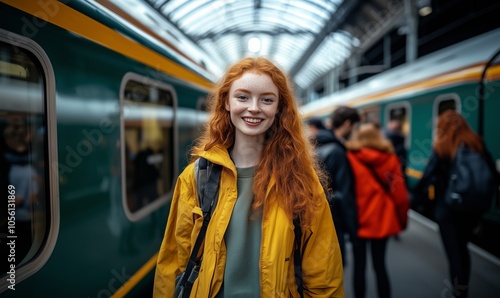 © Krisartist94, Fototapeta premium A Smiling Young Woman With Red Hair in a Yellow Jacket Waits at a Train Station Surrounded by Travelers During a Sunny Day