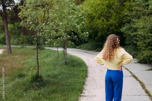 Naklejka premium A smilling girl with blond curly hair dressed in blue jeans and a yellow shirt, wearing sunglasses, stands on a path in a picturesque park in summer.