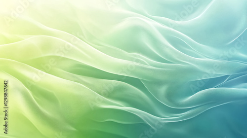 © Jum, Obraz premium A smooth, flowing abstract background in soft green and blue hues, resembling delicate fabric waves, mist, or energy, creating a serene and calming effect.