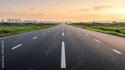 © SnapNest, Naklejka premium A smooth highway surrounded by minimalistic urban structures and natural green areas, with soft sunlight creating a peaceful atmosphere, urban road, serene landscape