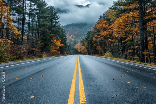 Naklejka premium A smooth road stretches through vibrant autumn foliage and misty mountains,...