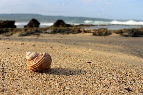 © Artanto, Obraz premium a snail shell washed ashore on the beach.