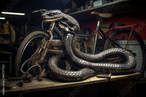 © Oleksandr, Obraz premium A snake coiled around a bicycle handlebar in a garage, its sinuous body contrasting with the metal.