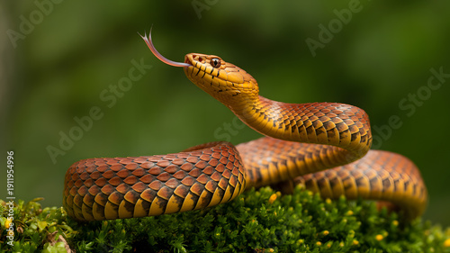 © Ali, Obraz premium A snake is coiled on moss with its tongue out in a natural environment.