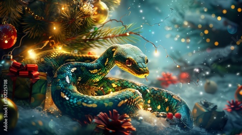 Fototapeta premium A snake is curled up on a Christmas tree