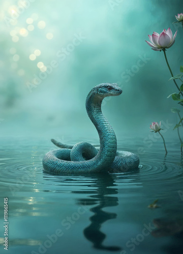 © David Angkawijaya, Fototapeta premium a snake is floating in the water with lotus flowers and bokeh lights effect on foggy background