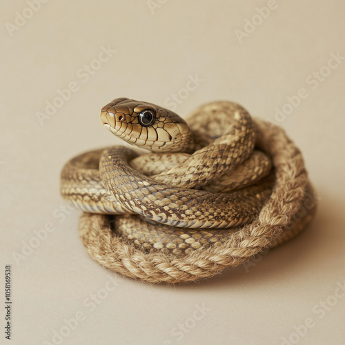 © sunaiart, Obraz premium A snake made of rope on a beige background.Copy space,flat lay