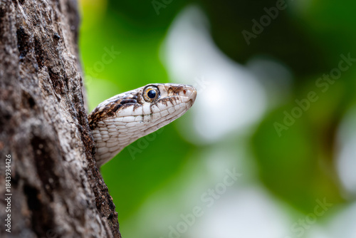 Naklejka premium A snake peeking from behind a tree trunk with a blurred green forest...