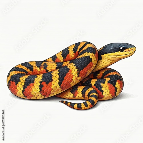© Lina, Obraz premium A snake with black, yellow, and orange scales. White background.