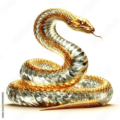 Obraz premium A snake with gold and gem scales is raising its head and coiling on a white...