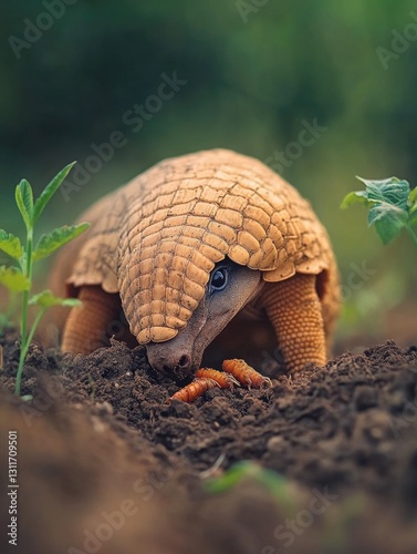 © vefimov, Obraz premium A snapping turtle is seen grazing in a garden patch with plants and flowers.