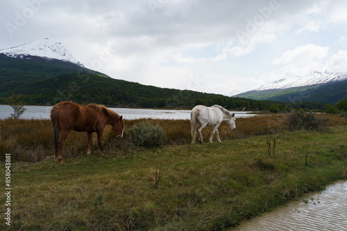 © Samuel, Obraz premium A snow-capped Andean mountain and beautiful green forest on the banks of a river, with horses grazing in the Tierra de Fuego National Park, Ushuaia - Argentina