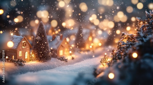 © P.G, Naklejka premium A snow-covered Christmas scene with glowing lights and festive decorations, capturing the happiness and new beginnings of the holiday season.